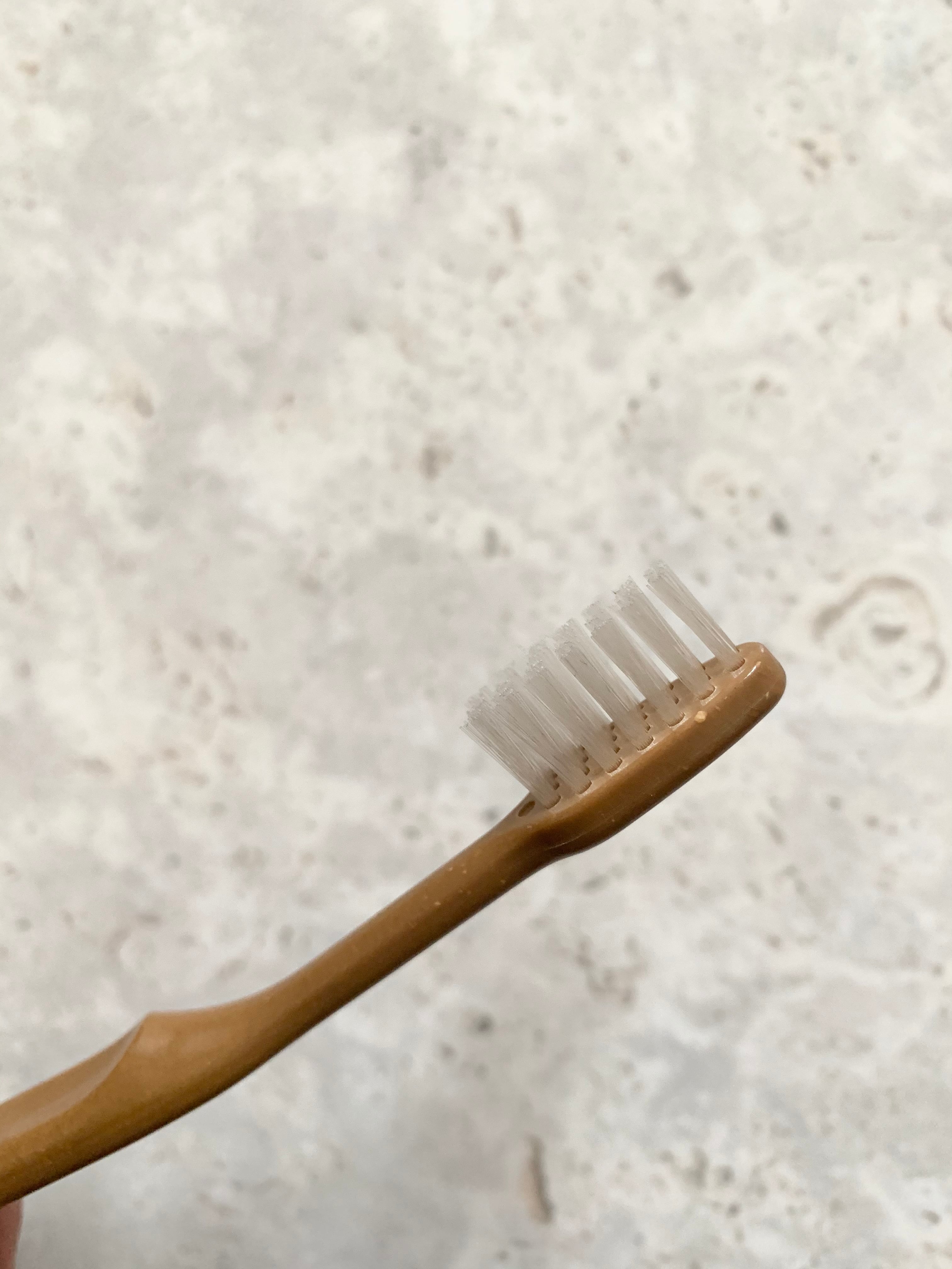 ♻︎自然由来のため2年で分解が始まるバイオマス歯ブラシ。生分解性が始まる目安の日付が柄に記載されています。